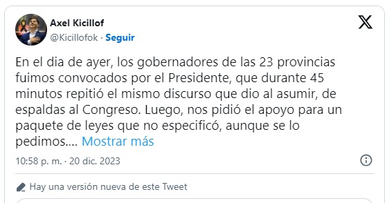 El gobernador de la provincia de Buenos Aires, Axel Kicillof, aseguró que el Decreto de Necesidad de Urgencia (DNU) de desregulación económica anunciado por el presidente Javier Milei “se propone privatizar todo, desregular todo y destruir derechos de los trabajadores”.