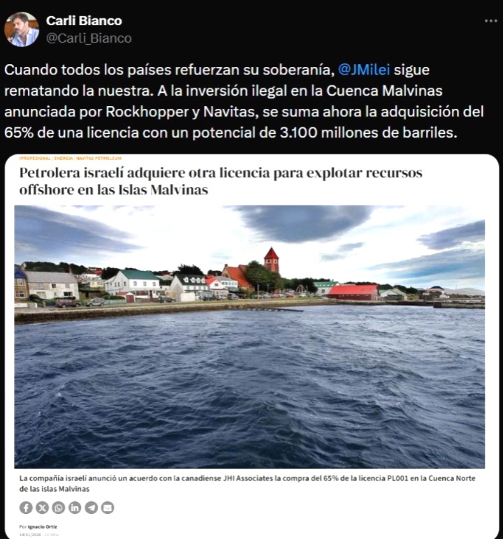 En las últimas horas se conoció la noticia de que la empresa Navitas Petroleum and Production Limited, de origen israelí, comenzará a realizar perforaciones de petróleo, de manera ilegal, en las Islas Malvinas. Específicamente lo hará en una zona de aproximadamente 1.126 km² con potencial estimado de 3.100 millones de barriles de recursos petroleros. Al respecto, el ministro de Gobierno provincial de la provincia de Buenos Aires, Carlos Bianco, advirtió sobre ello a través de sus redes sociales y acusó al presidente libertario, Javier Milei, de «rematar la soberanía del país».