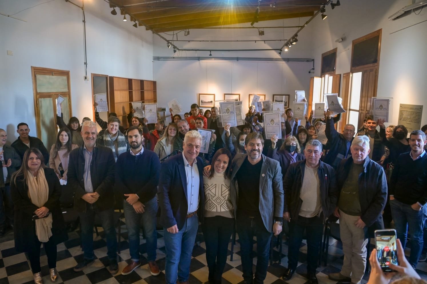 La entrega tuvo lugar en la Casa Cagliero (Anexo del Museo Emma Nozzi) y estuvo encabezada por el Jefe de Asesores del Gobernador la provincia de Buenos Aires, Carlos Bianco; el intendente José Luis Zara y la Escribana Adscripta Superior de la Escribanía General de Gobierno, Cibiana Blanco.