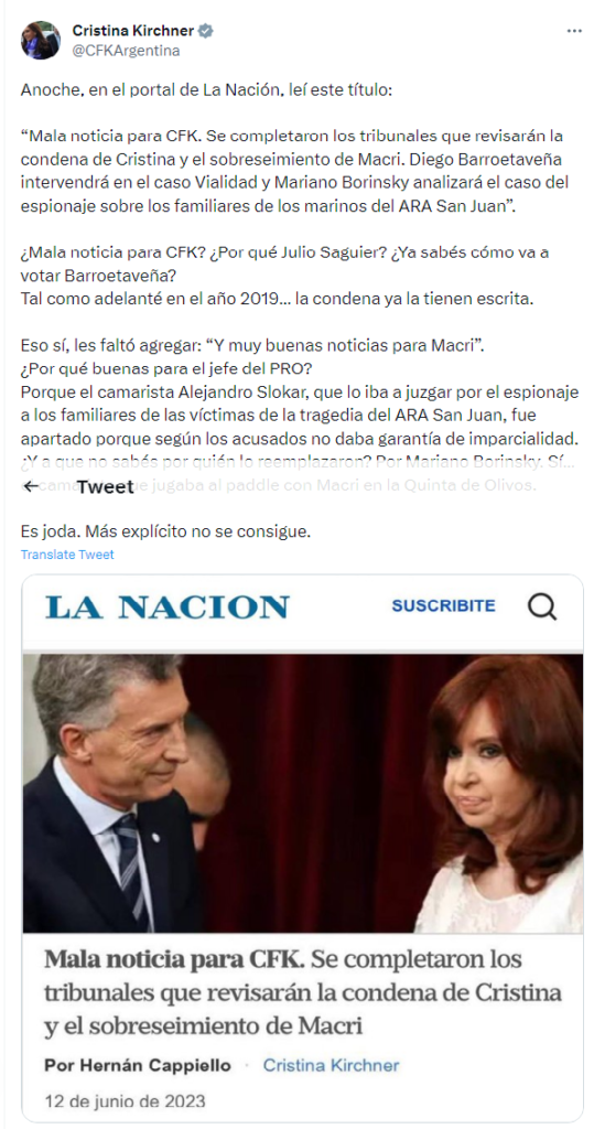 «Anoche, en el portal de La Nación, leí este título: ‘Mala noticia para CFK. Se completaron los tribunales que revisarán la condena de Cristina y el sobreseimiento de Macri. Diego Barroetaveña intervendrá en el caso Vialidad y Mariano Borinsky analizará el caso del espionaje sobre los familiares de los marinos del ARA San Juan’. ¿Mala noticia para CFK? ¿Por qué Julio Saguier? ¿Ya sabés cómo va a votar Barroetaveña?», tuiteó Cristina.