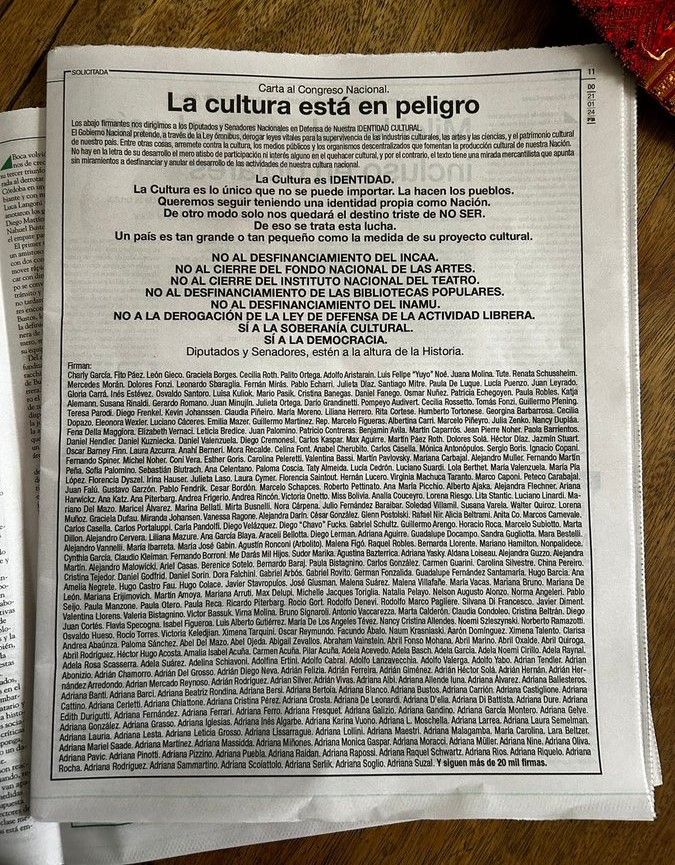 «El Gobierno Nacional pretende, a través de la Ley Ómnibus, derogar leyes vitales para la supervivencia de las industrias culturales, las artes y las ciencias, y el patrimonio cultural de nuestro país», dice uno de los fragmentos del texto.