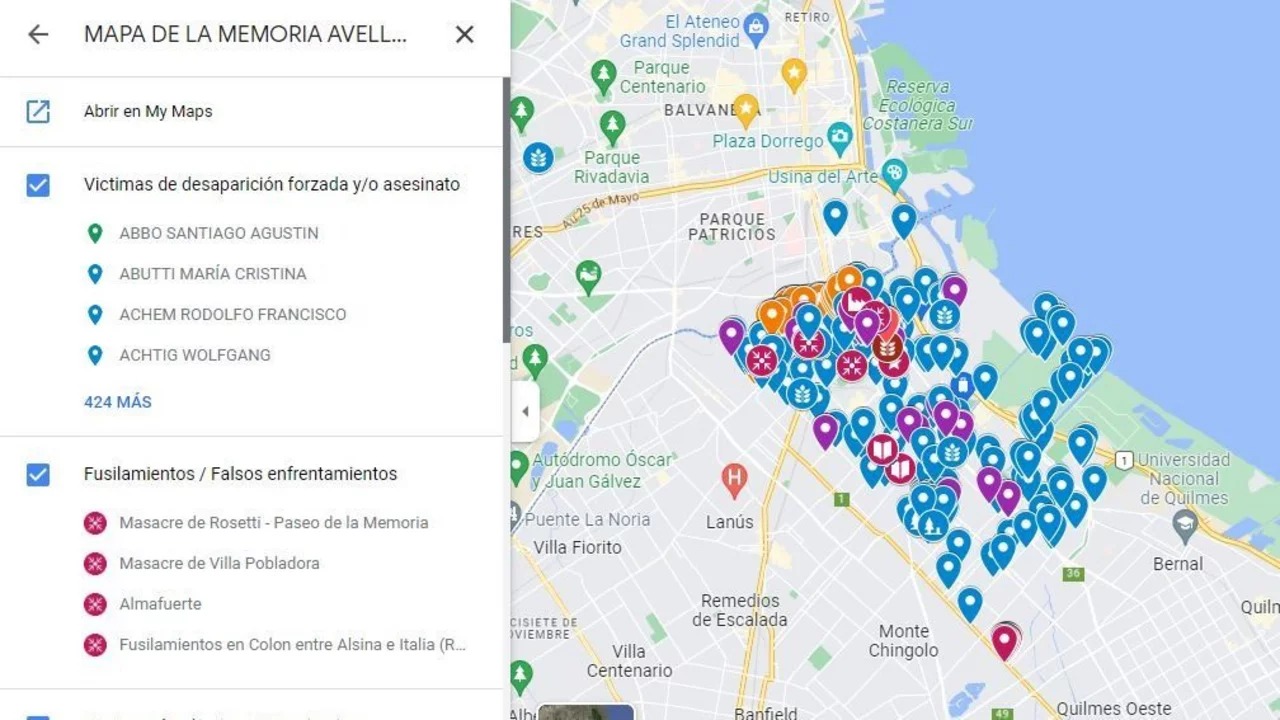 En el «mapa de la memoria» se pueden ver señalizados los puntos donde vivían, fueron secuestrados, fusilados o encontraron cuerpos de ciudadanos de Avellaneda durante la dictadura militar de 1976.