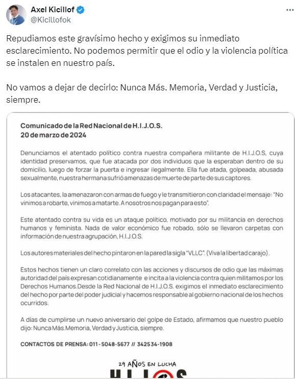 «Repudiamos este gravísimo hecho y exigimos su inmediato esclarecimiento. No podemos permitir que el odio y la violencia política se instalen en nuestro país. No vamos a dejar de decirlo: Nunca Más. Memoria, Verdad y Justicia, siempre», apuntó Kicillof.