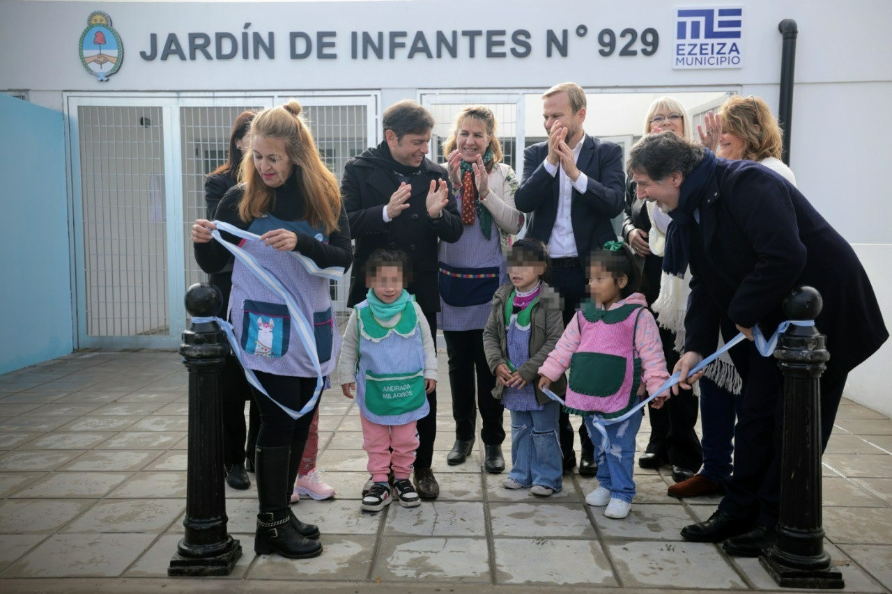 El gobernador de la provincia de Buenos Aires, Axel Kicillof, encabezó el acto de inauguración del edificio del nuevo Jardín de Infantes N° 929 en el municipio de Ezeiza, junto al director general de Cultura y Educación, Alberto Sileoni, y el intendente interino, Gastón Granados.