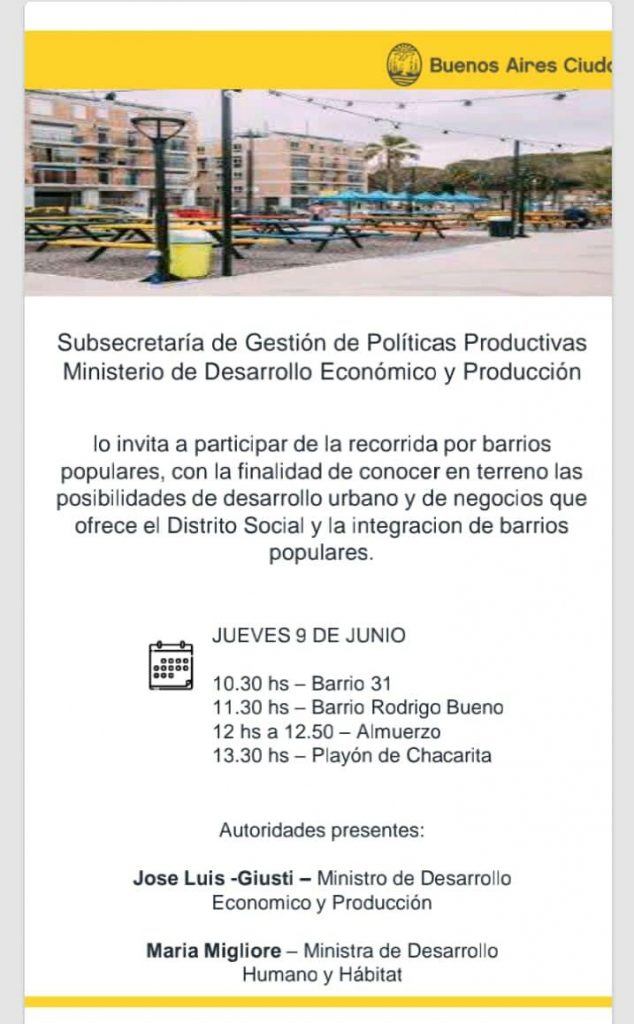Casi en las sombras, a espaldas de los vecinos y vecinas de la Ciudad y sólo con invitaciones VIP a diferentes empresas, el ejecutivo porteño dio inicio con su ambicioso plan en los barrios más postergados: “la subsecretaria de gestión de políticas productivas lo invita a participar de la recorrida por los barrios populares con la finalidad de conocer en terreno las posibilidades de desarrollo urbano y de negocios que ofrece el distrito social y la integración de los barrios populares”, detalla cada una de las invitaciones. La primera recorrida por los barrios populares fue este jueves y estuvieron presentes, la Ministra de Desarrollo Humano y Hábitat de la Ciudad, María Migliore y el titular de la cartera de Desarrollo Económico y Producción, José Luis Giusti.