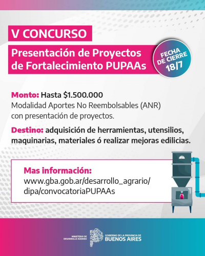 Con el objetivo de continuar acompañando a los pequeños productores bonaerenses, el Ministerio de Desarrollo Agrario de la Provincia de Buenos Aires lanza el “Quinto Concurso de Proyectos para el Fortalecimiento de Pequeñas Unidades Productivas de Alimentos” (PUPAAs), una iniciativa que busca impulsar y formalizar emprendimientos dedicados a la elaboración artesanal de alimentos.