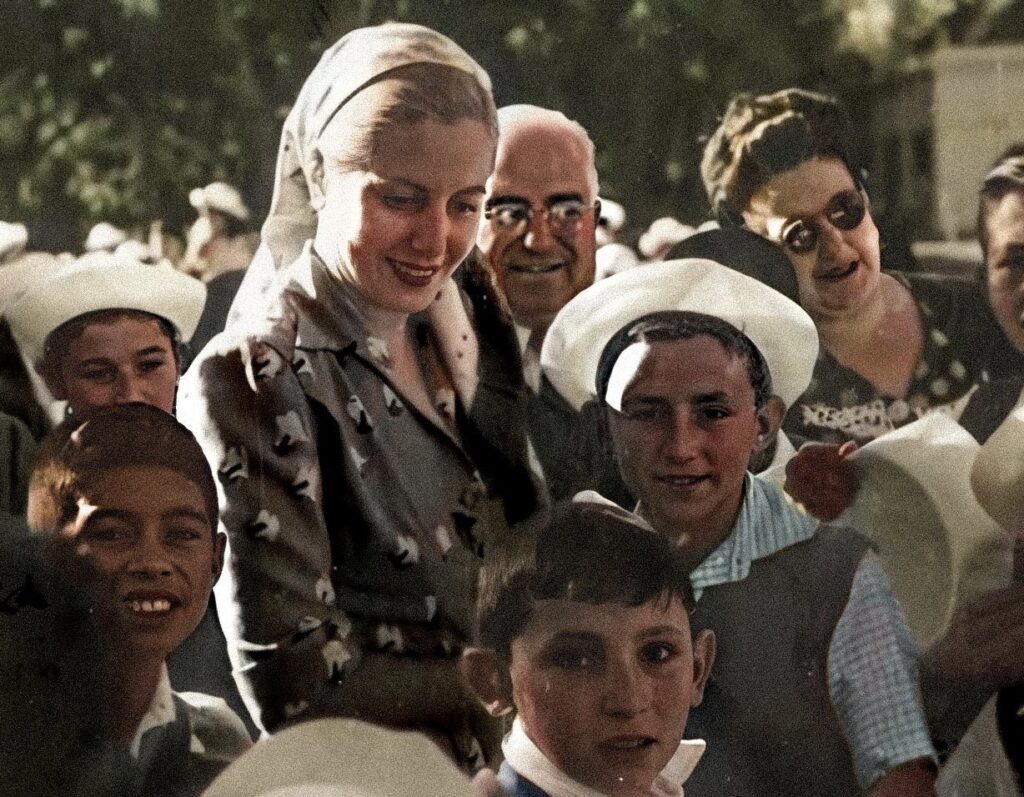 Eva Duarte nació en Los Toldos, Provincia de Buenos Aires, el 7 de mayo de 1919. Fue actriz, incursionó en la radiofonía de esa época, hasta que conoció al general Juan Domingo Perón y se casó con él. A partir de ese momento fue una pieza clave y comenzó a desarrollar un papel fundamental en el escenario político. Falleció el 26 de julio de 1952, con tan solo 33 años.