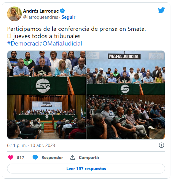 Dirigentes de distintos espacios políticos, sociales y sindicales ofrecieron una conferencia de prensa para brindar detalles de la marcha que se realizará el jueves 13 de abril a tribunales bajo el lema «Democracia o mafia judicial».