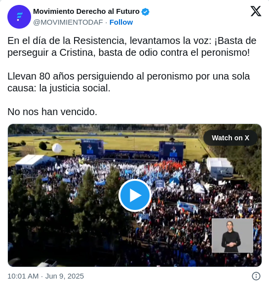 “En el día de la Resistencia, levantamos la voz: ¡Basta de perseguir a Cristina, basta de odio contra el peronismo! Llevan 80 años persiguiendo al peronismo por una sola causa: la justicia social. No nos han vencido”, posteó el Movimiento Derecho al Futuro que lidera Axel Kicillof.