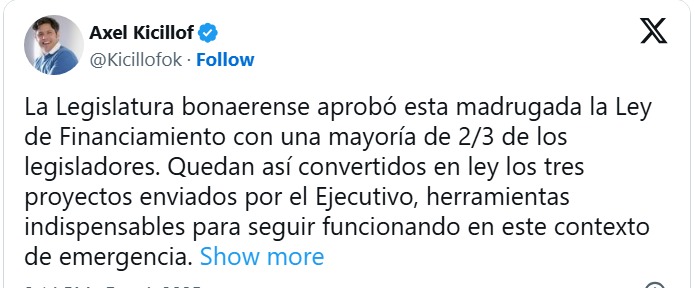 A través de sus redes sociales, se refirió a la Ley de Financiamiento y señaló que “la Provincia podrá cumplir con los vencimientos de la deuda generada por el gobierno de María Eugenia Vidal sin que se vean comprometidos los recursos para salud, educación, seguridad, obras y demás necesidades de las y los bonaerenses”.