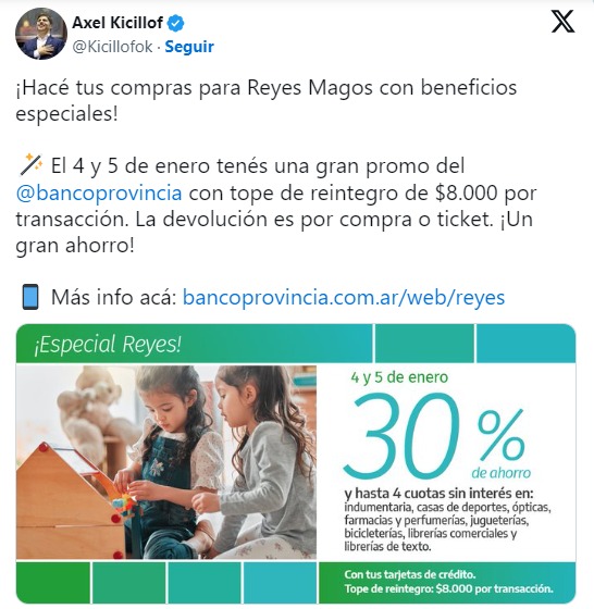 Hoy y mañana el Banco Provincia ofrece una promoción en compras con tarjeta de crédito para la fiesta de Reyes, que tendrá un tope de reintegro de $8.000 por transacción.