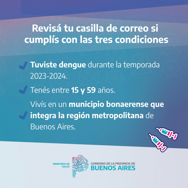 Desde la cartera de Salud recordaron que las personas que cumplen las condiciones para vacunarse contra el dengue son aquellas que tuvieron la enfermedad durante la temporada 2023-2024; tienen entre 15 y 59 años y vivan en un municipio que integre la región metropolitana de Buenos Aires.